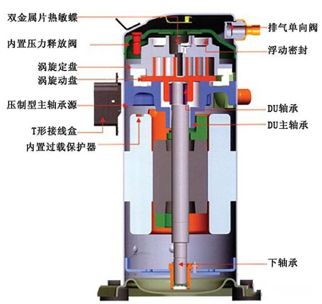 多聯機渦旋壓縮機是一種容積式壓縮機,其壓縮部件由動渦旋和靜渦旋組成。其工作原理是利用動靜渦旋的相對公轉運動,形成封閉容積的連續變化,從而達到壓縮氣體的目的。