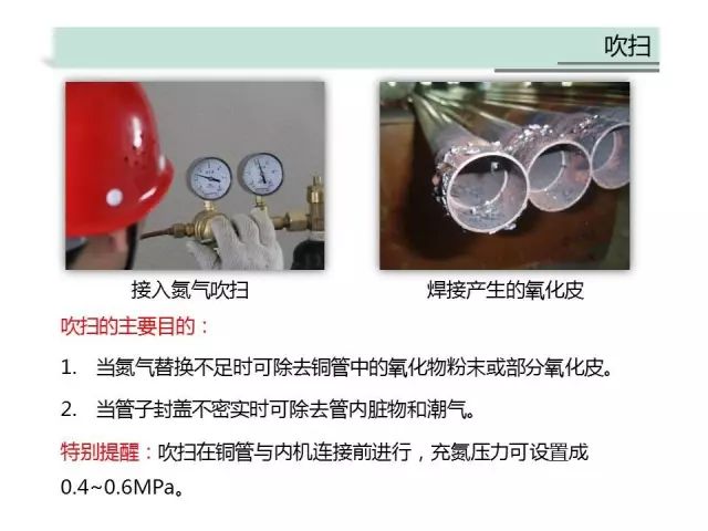 ②、為了避免這些問題,釬焊時結束必須持續向冷媒管通入氮氣10s以上,并確保氮氣流經正在操作的焊點,直至焊接結束,銅管完全冷卻為止。