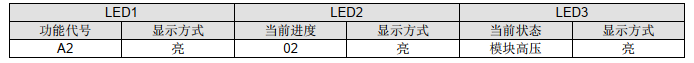 LED3顯示的為模塊的低壓值,如果為負(fù)值,LED3則每1秒循環(huán)顯示“負(fù)號(hào)”代碼“ nE”與數(shù)值表示。例如:-30度,先顯示“nE”, 1秒后顯示“30”,如此循環(huán)。