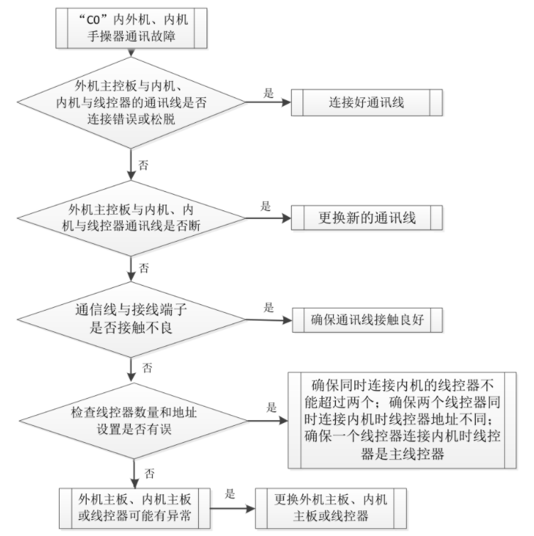 如果外機主控板沒有顯示C0,則檢查內機與手操器之間的網絡;如果外機主控板、內機燈板和線控器全部報C0,則需要檢查內外機之間、內機與手操器之間的網絡;如果只有線控器報C0,則檢查內機與手操器之間的網絡以及線控器數量和地址設置。