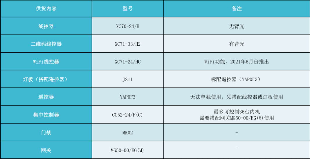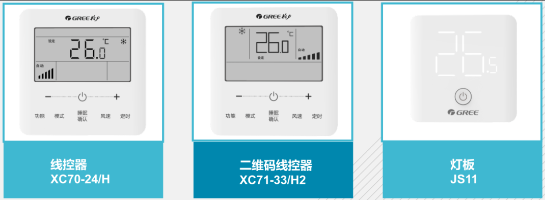 下表為常用的三款線控器,風管機對應的這幾款線控器都有隱藏的遙控接收頭,都可以使用遙控器控制。如果想實現手機APP控制空調,遠程開關機,請選用XC71-24/HC帶wifi功能的線控器。格力多聯機和風管機統一使用的一款遙控器就是YAPOF3.