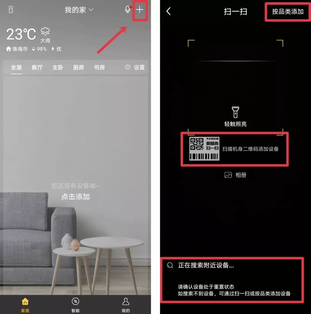 打開“格力+”APP(或小程序),點擊手機右上角“+”圖標,選擇以下三個方式進行連接: