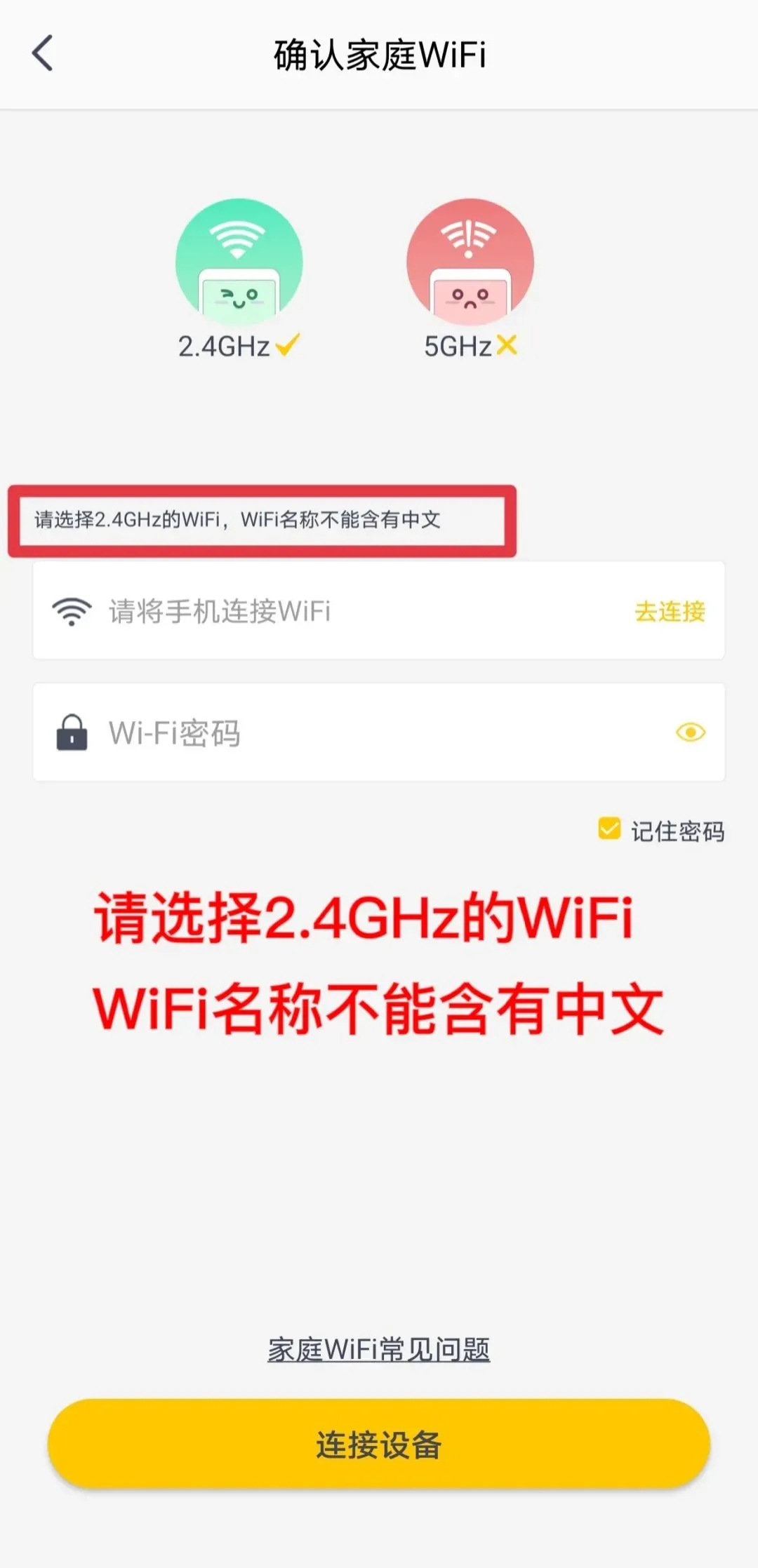 ② 確認家庭WiFi:需要注意的是:選擇2.4GHz的WiFi,同時WiFi名稱中不能含有中文。如果手機已添加過家庭WiFi的,該步驟則會自動跳過,點擊連接設備(等待產品自動連接完成就可以了)。