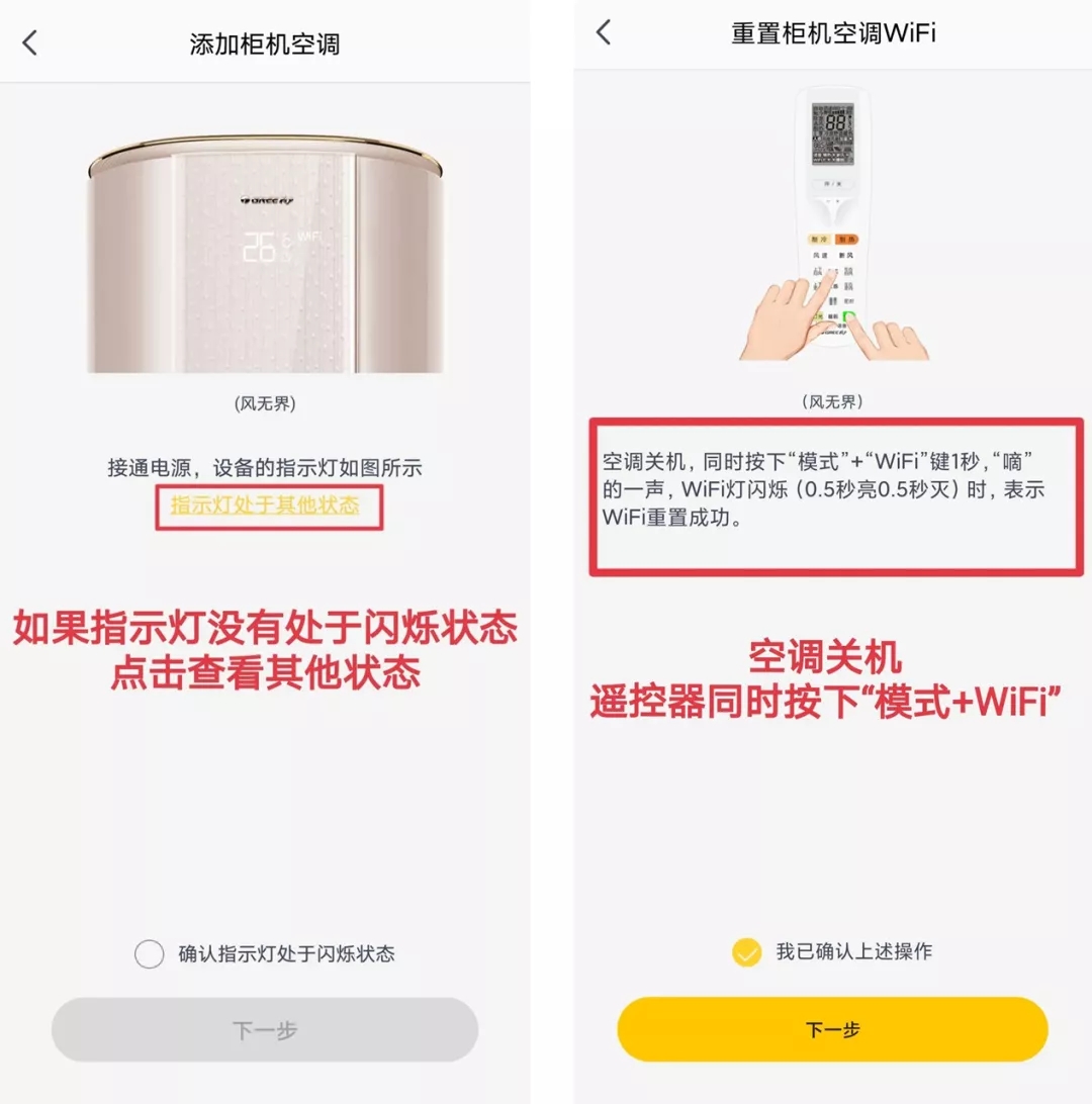 ① 重置產品:產品處于通電待機狀態下,搜索產品選擇綁定(注意:搜到后,產品需要進行“重置”)。重置操作:設備待機狀態下,用該產品的遙控器同時按“模式+WiFi”鍵,聽到“滴”一聲表明已處于重置狀態。(注意:重置需在2分鐘內完成,超時需要重新配置)