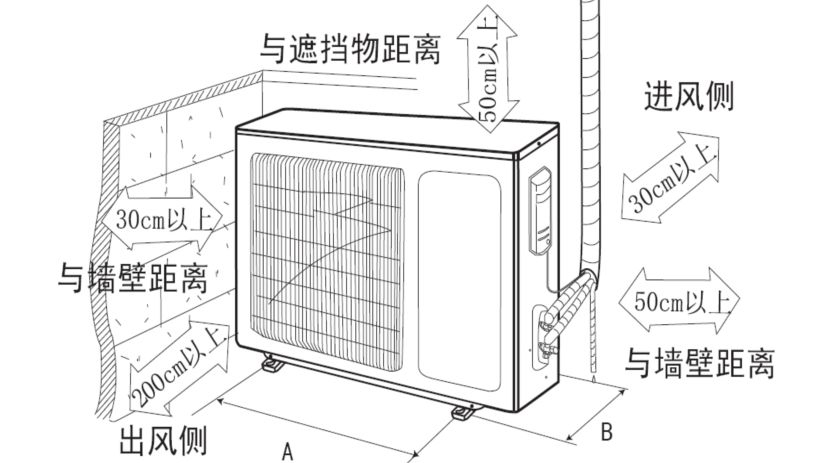 室外機安裝位置選取:空調室外機離墻必須一米以上,保證散熱,并且有足夠維修空間。室外機在與基礎接觸的安裝孔和受力點處墊上減震墊,用螺母固定。