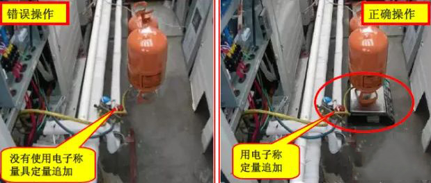 根據實際的液管尺寸和長度,通過公式計算冷媒追加量,將追加的冷媒量記錄在室外機冷媒追加表中;不能以測量運轉電流,壓力等方式估 計冷媒量。