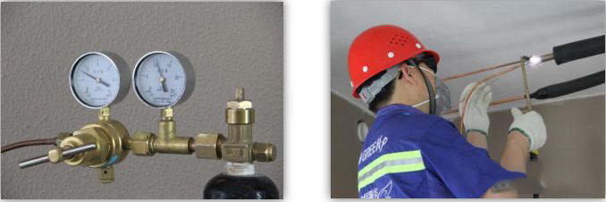 b.確定氮氣路徑,將氮氣管插入到要實施焊接的冷媒管入口處并封口,打開氮氣瓶閥門,通過減壓閥調節好氮氣的氣流,最后實施焊接。