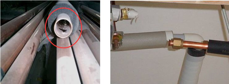 冷媒管道保溫材料應使用閉孔發泡保溫材料,難燃B1級,耐熱性超過120℃的材料。銅管外徑D≤12.7MM時,保溫層厚度&=15MM以上;銅管外徑D≥15.88MM時,保溫層厚度&=20MM以上。冷凝水管應采用難燃B1級橡塑保溫筒保溫,保溫層厚度通常為10MM。管道穿墻須套管。