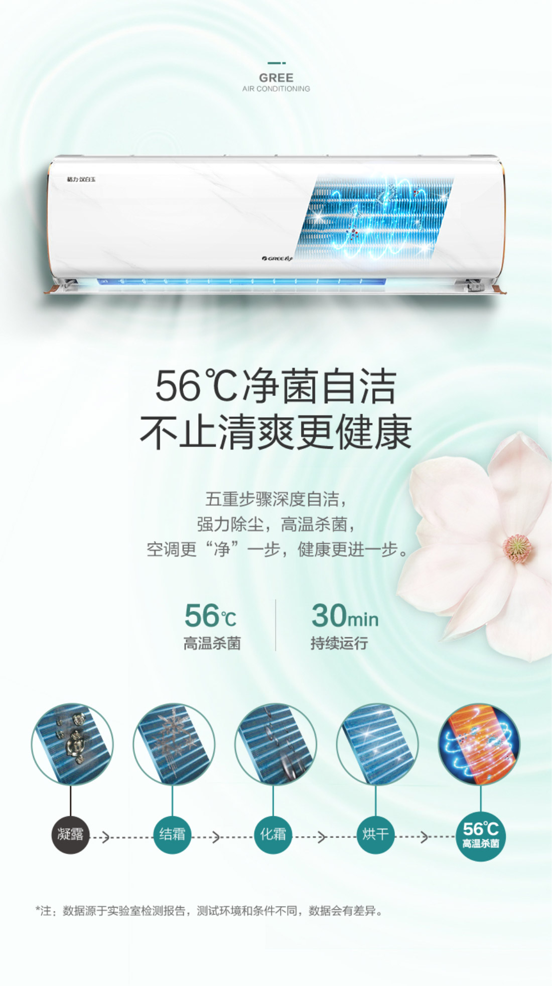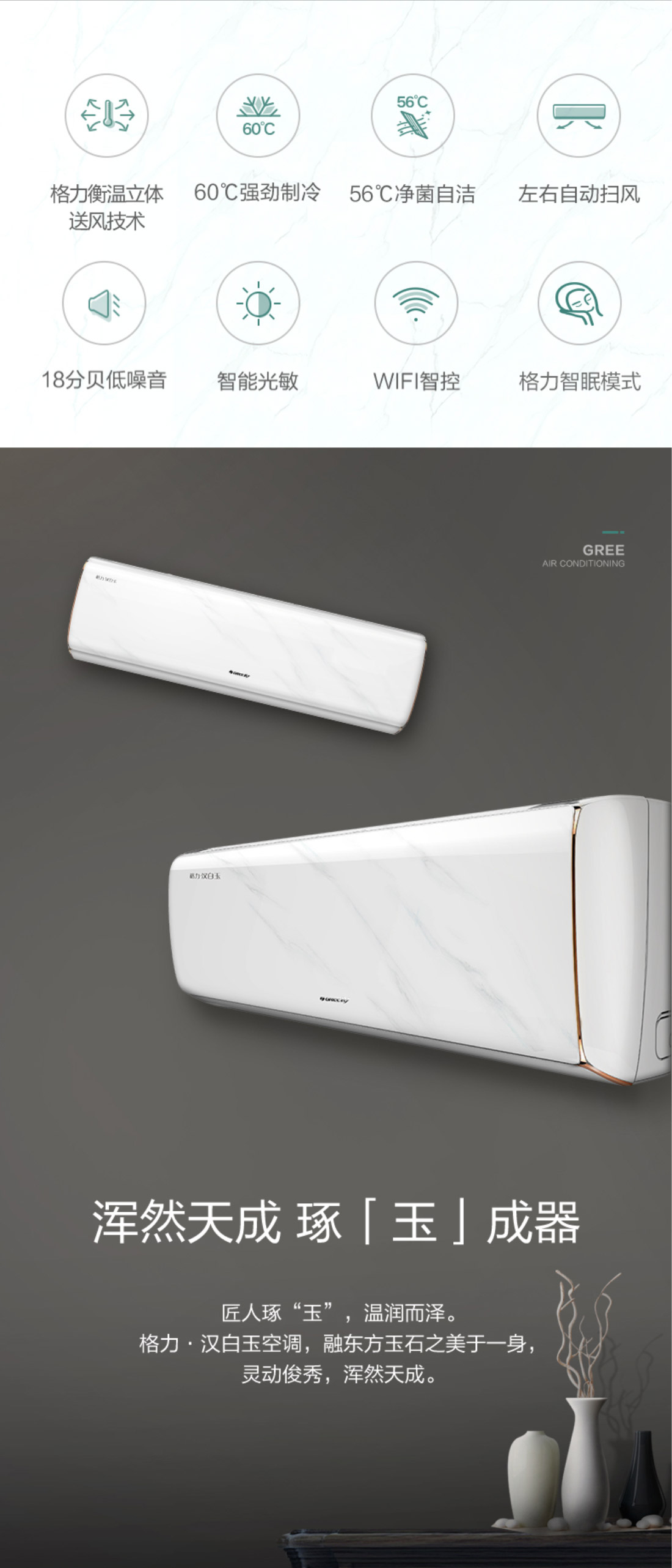 格力·漢白玉 潔白無瑕,玉滿中華。細膩的玉石紋理外觀,搭載360度運動大導風板、56℃凈菌自潔系統、第二代格力冷酷外機,內外兼修,盡顯風范。